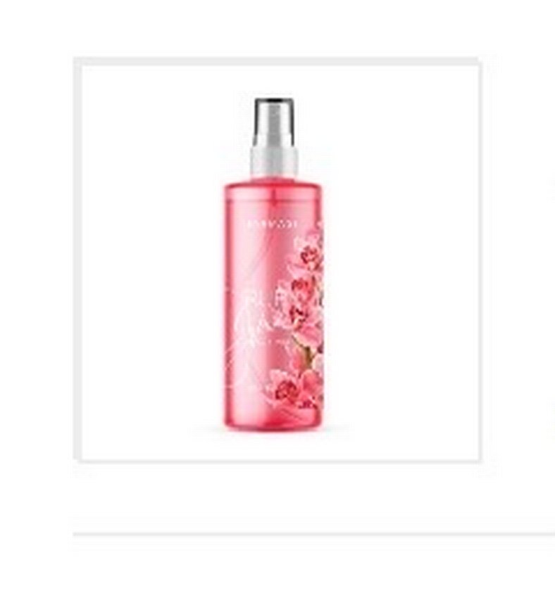 Pembe sprey şişede çiçek desenleri bulunan kadın parfümü, ferah ve çiçeksi bir koku sunar.