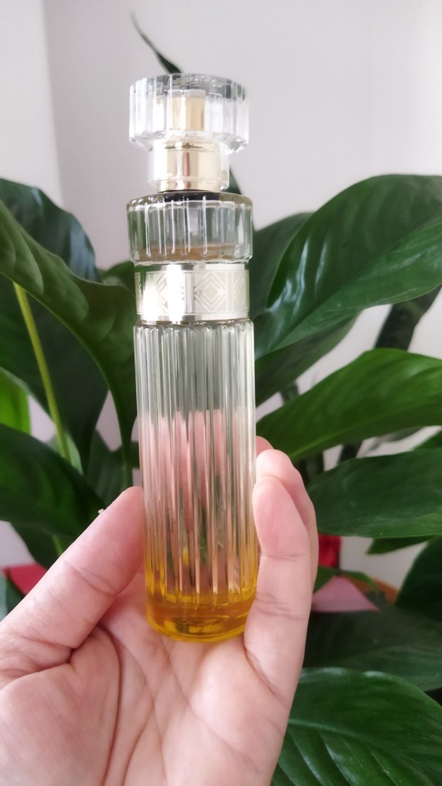 Kabartmalı cam tasarımlı, altın detaylı kadın parfüm şişesi. İçinde kehribar renkli parfüm sıvısı bulunur.
