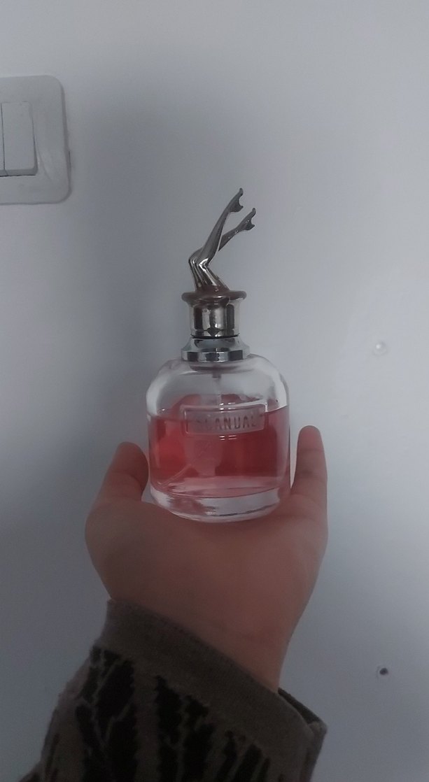 Pembe sıvı içeren, üstü bacak şeklinde metal kapaklı kadın parfümü şişesi.