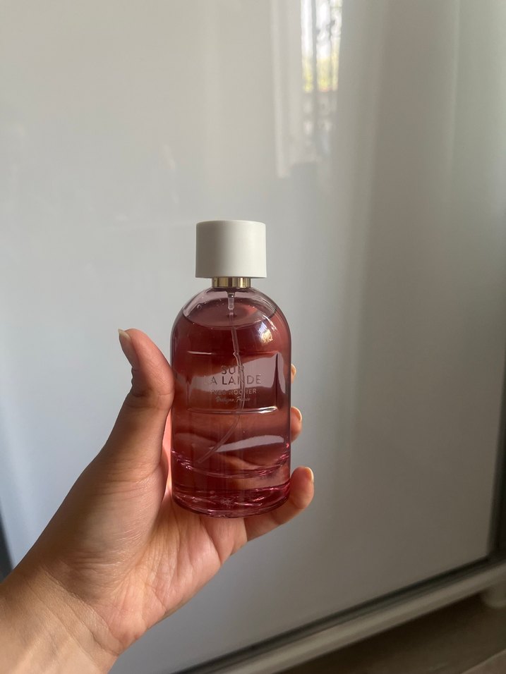 Şeffaf pembe şişede, beyaz kapaklı kadın parfümü, zarif ve hafif bir koku sunar.