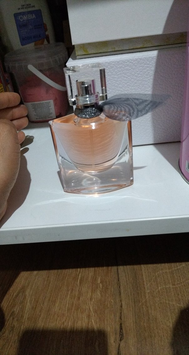 Şeffaf cam şişede, açık pembe renkte kadın parfümü, gümüş detaylı sprey başlığı ile birlikte.