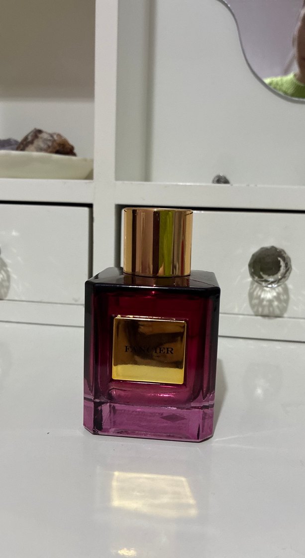 Altın kapaklı, koyu kırmızı ve pembe tonlarında şık bir şişede kadın parfümü. Şişede altın renkli bir etiket bulunur. Hiç kullanılmamıştır.