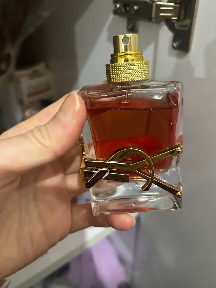 Altın sprey başlıklı, alt kısmında dekoratif altın bant bulunan kadın parfüm şişesi. İçindeki sıvı kehribar rengindedir.