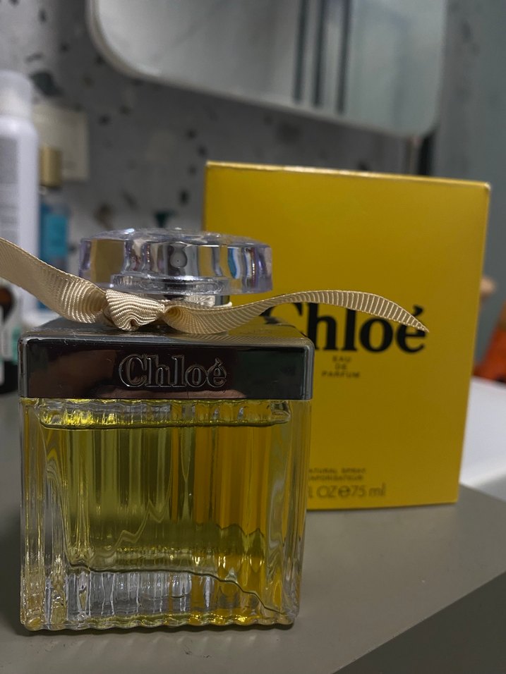 Altın renkli sıvı içeren, şeffaf cam tasarımlı, boynunda bej renk fiyonk bulunan kadın parfümü şişesi. ✨ chloe parfüm orijinal hiç kullanılmadı kutusu mevcut 75 ml