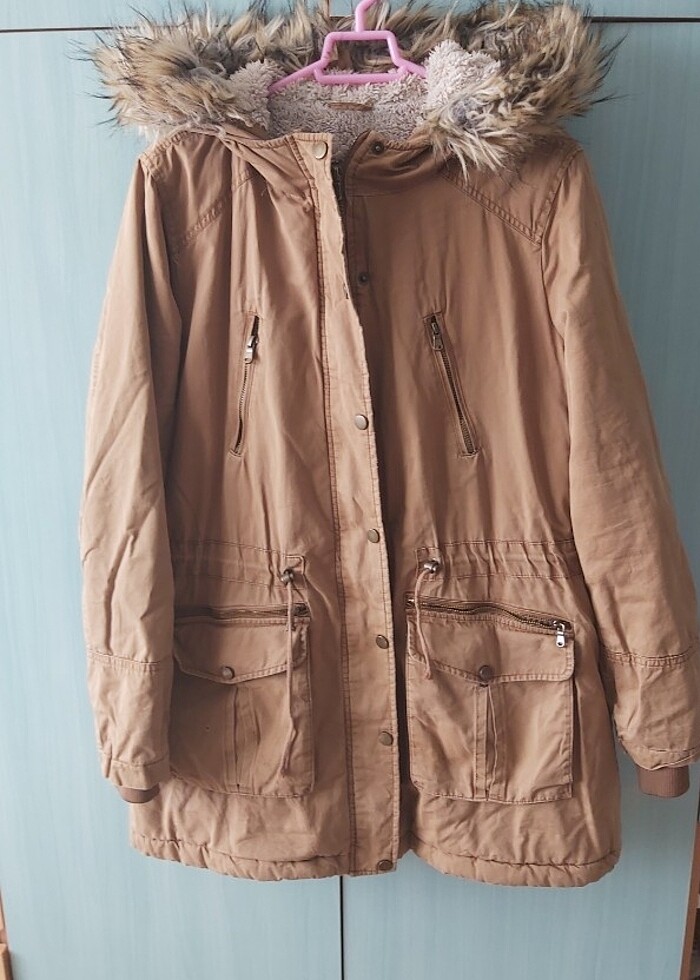 Camel renkli parka İç kısmı kürklü kolları manşetli rüzgar geçirmez , önde yanlarda 2 büyük cep var Kapüşonu düğmeli isterseniz çıkarılabilir. Kapüşon etrafı tüylü parka Kullanıldı ama sağlam sade?e sağ cep üzerinde bir hatadır var elde tutturmak gerek bilginize Ölçüleri koltuk altından En 60 cm Omuz dikişinden Boyu 82cm Kol Boyu 67 cm