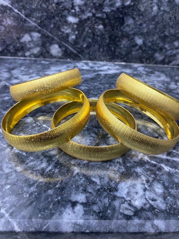Shte parlak altın renkli kadın bilezikleri. Desensiz ve klasik şıklıkta, düğün gibi özel günler için uygun. Kaç kişi gördü shte olduğunu anlamadı içinde siyah leke var ama kimse alıp bakmadığı sürece görmez yarı fiyatına veriyorum