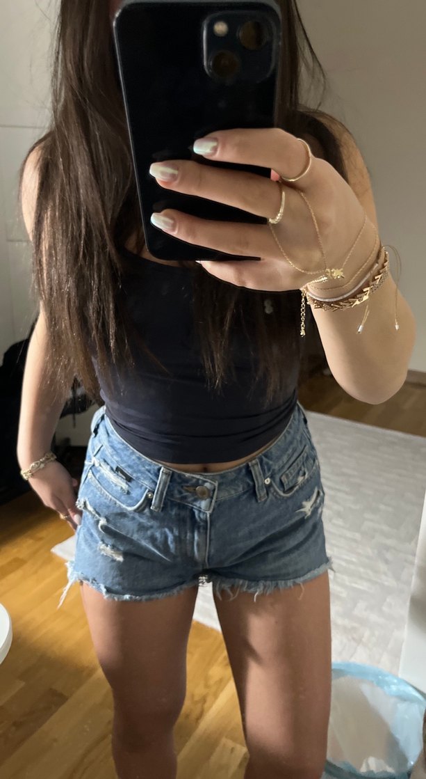 Parlak altın renkli, kemerli ve mini uzunlukta, dar kesim kadın denim şort. Desensiz ve günlük sokak tarzına uygun. ✨