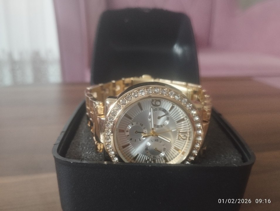 Parlak altın renkli, kemerli kayışa sahip kadın saati. Çağdaş tasarım ve klasik zarafet sunar. ✨