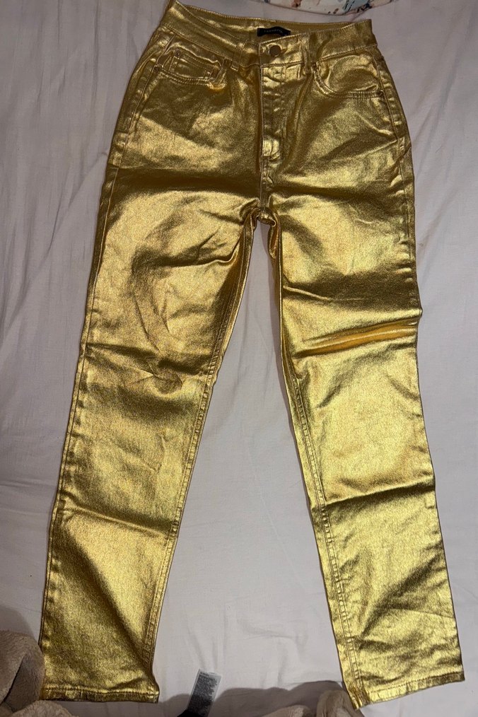Kadınlar için parlak altın renkte, ipeksi kumaştan, parlak ve normal kesim midi boy pantolon. Sokak stiline uygun, günlük kullanıma ideal. ✨ Kombinleyemediğim için satıyorum hiç giyilmedi