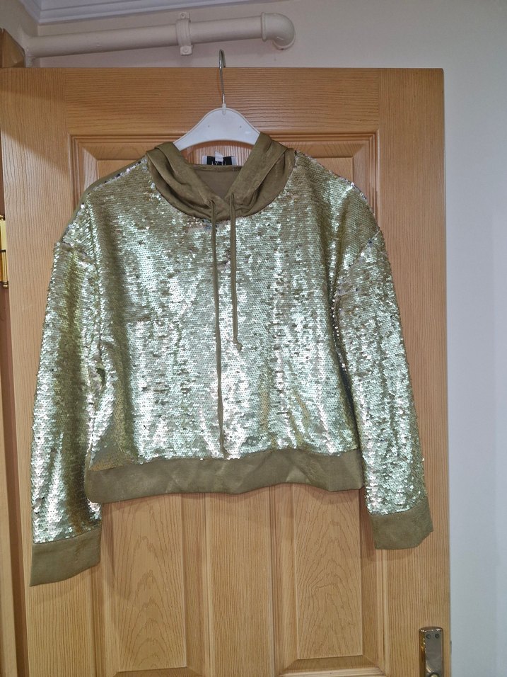 Uzun kollu, yuvarlak yaka, bol kesim kadın sweatshirtü parlak altın simli kumaştan. 38 bedendir. Günlük kullanıma uygun rahat stil. ✨