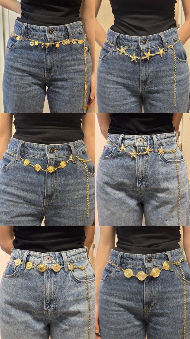 Altın renkli, tokalı kot kemerleri, parlak yıldız ve madeni para süslemeleriyle, trend sokak stili için uygun.