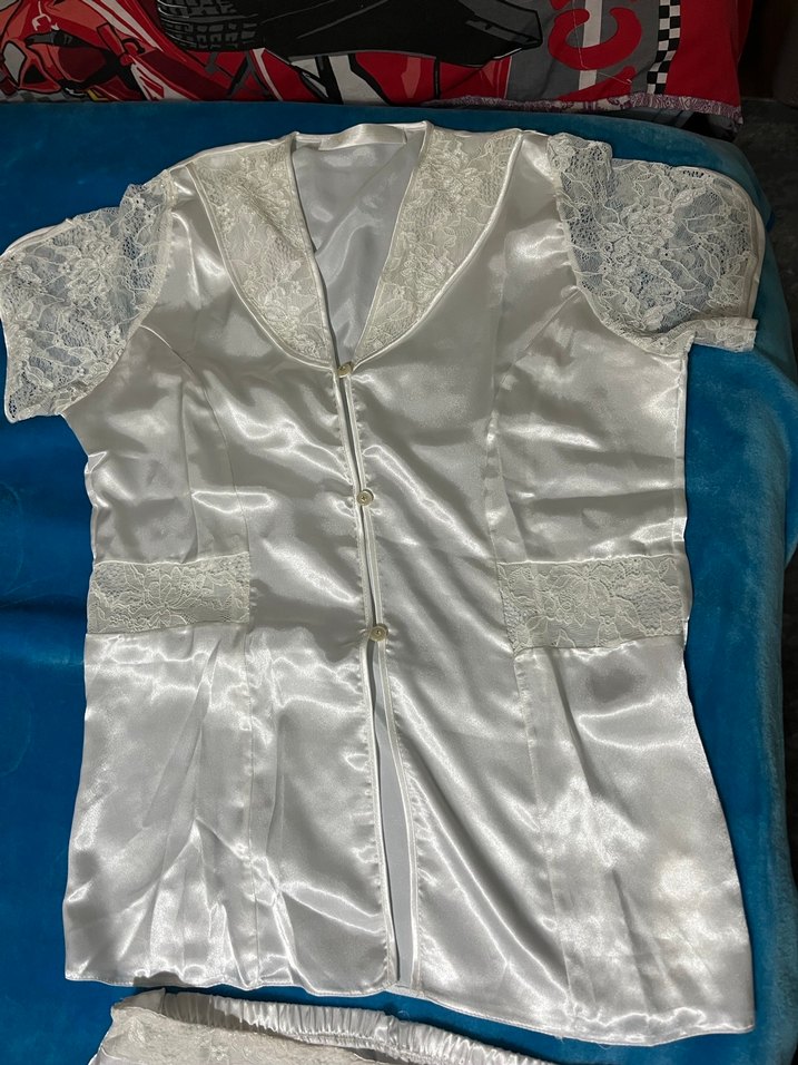 Kadınlar için parlak beyaz, düz renkli, kısa kollu ve elastik bel bantlı pijama şortudur. 6 parça hepsinin fiyatıdır saten kumaş şortu şort içi iç atleti gömleği uzun ipli elbisesi dantelli uzun kollu elbisesi hepsi birliktedir
