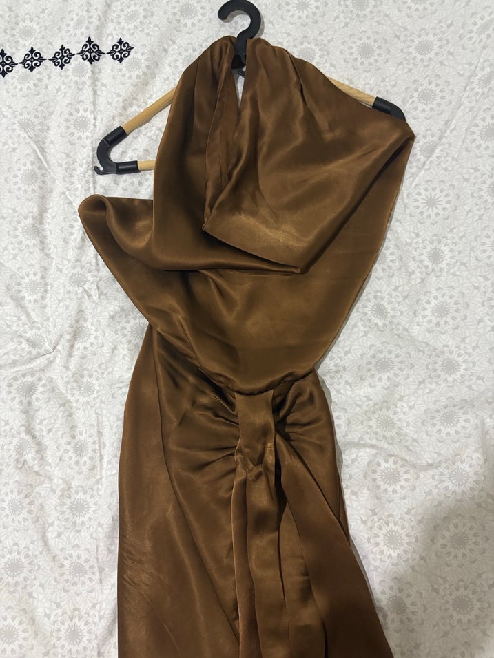 Kadınlar için parlak bej saten kumaştan, drapeli tasarıma sahip minimalist ve bohem tarzda arkası açık elbise. ✨