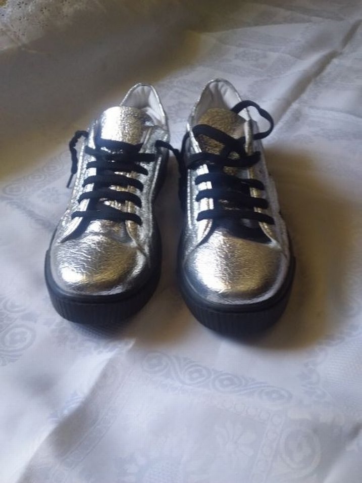 Kadınlar için parlak gri renkte, siyah bağcıklı ve tokalı spor ayakkabılar. Düz tabanlı, spor ve sokak tarzına uygun. ♀️