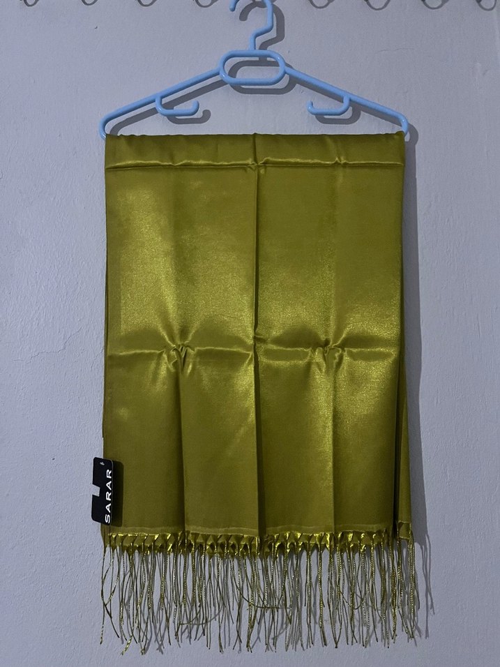 Kadınlar için parlak haki renkli, ipek görünümlü ve drapeli şal. Uçları püsküllü, bohem ve avangart tarzda şık bir aksesuar.
