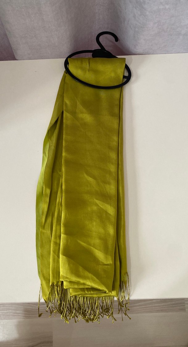 Kadınlar için parlak haki renkte, ipek gibi yumuşak dokulu ve drapeli şal. Minimalist ve bohem tarzları bir araya getirir, modaya uygun ve avangart.