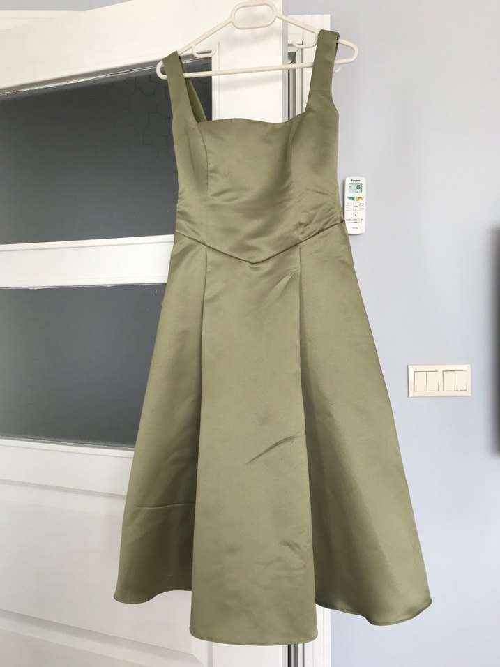 Parlak haki renkte, askılı ve kolsuz tasarıma sahip midi uzunlukta abiye elbise. Drapeli detaylar ve modern klasik kesim sunar, düğünler için uygundur. Sadeve 2 saat giyildi terzide kişiye göre düzenlemeler yapılmıştır istenirse ölçüler verilir