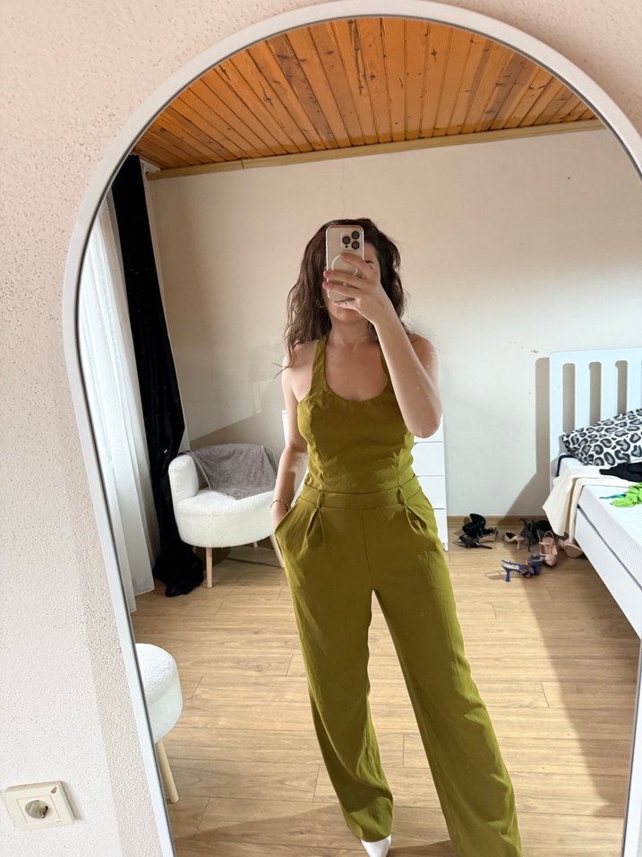 Kadınlar için parlak haki renkli, askılı ve straplez yaka detaylı midi boy, regular fit tulum. İpeksi kumaştan, günlük kullanıma uygun rahat ve şık.