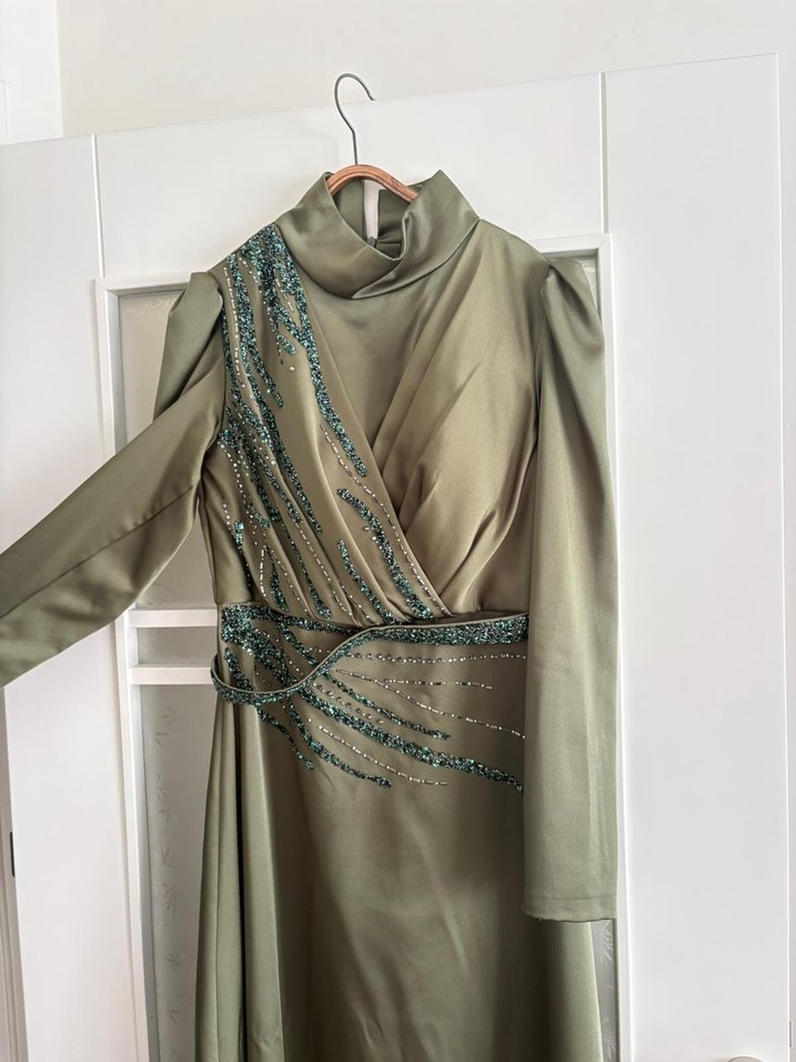 Parlak haki renkte, uzun ve vücuda oturan bu abiye elbise yüksek yakalıdır. Drapeli ve nakış detaylı, ince askılı kollu, çağdaş tarzda bir modeldir.