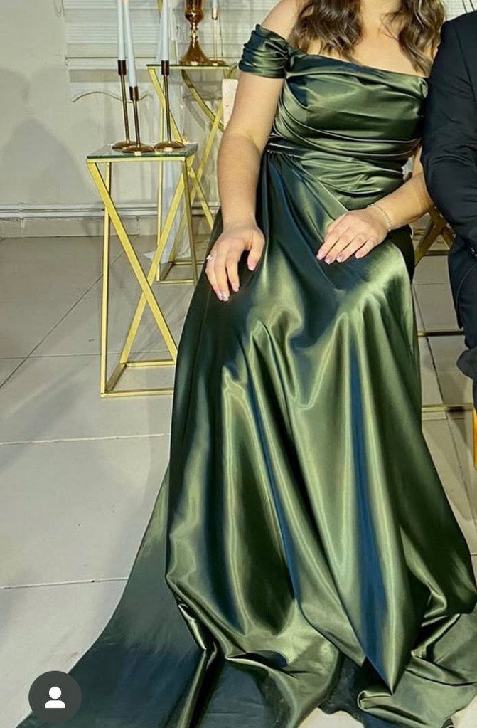 Kadınlar için parlak haki kumaştan, drapeli uzun abiye elbise. Kayık yaka ve ince askılı kollara sahip, modern klasik tarzda, düğünler için uygun, regular fit ve desensiz.saten