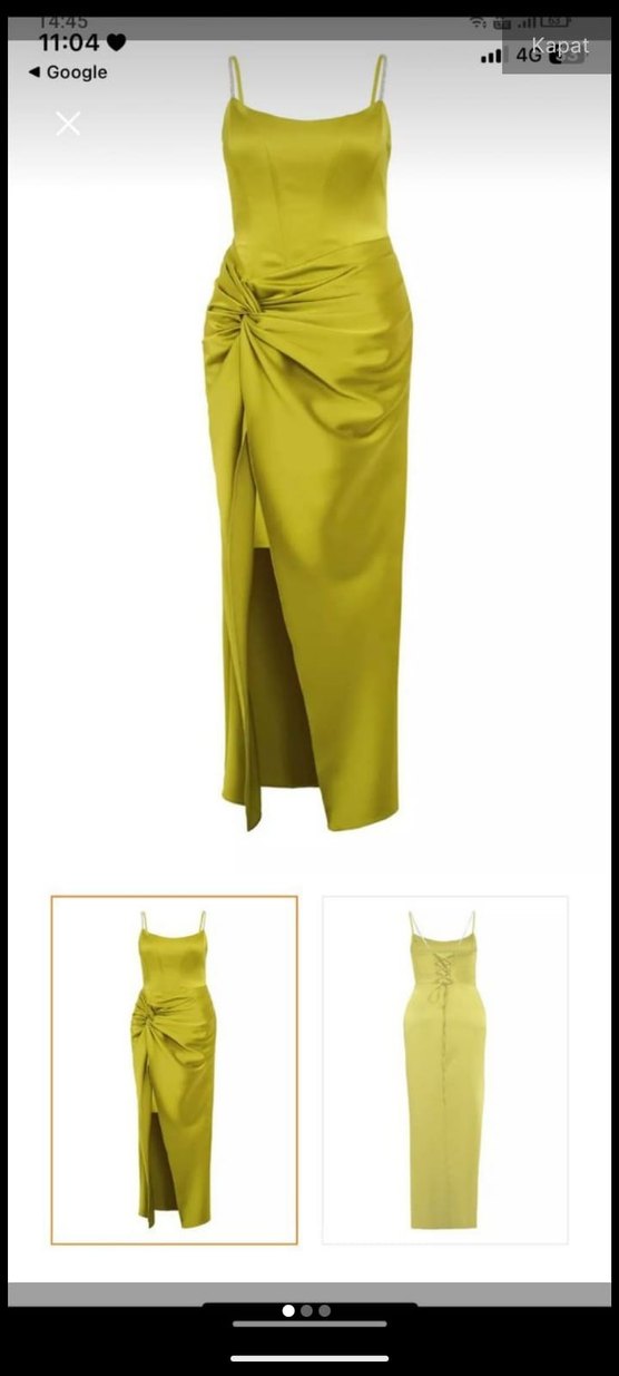 Parlak haki renkte, straplez ve drapeli uzun elbise, ince ve parlak kumaştan, modern parti tarzına uygun.
