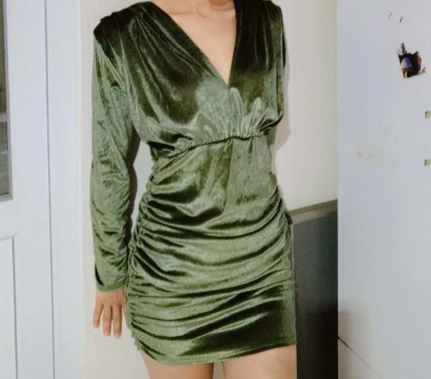 Parlak haki kumaştan, derin V yakalı ve uzun kollu, drapeli, vücuda oturan midi elbise. Romantik akşamlar için ideal. ✨