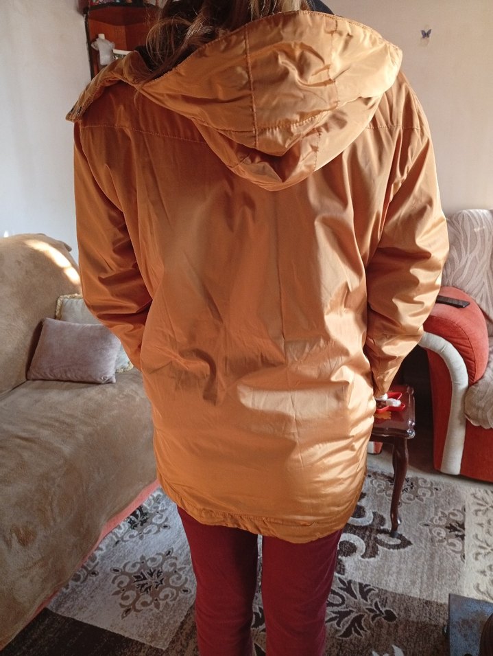 Bu kadın ceketi parlak kahverengi renkte, yüksek yakalı ve uzun kolludur. Bol kesim ve fermuarlı olup dış mekan sokak stili için uygundur. su hava geçirmez