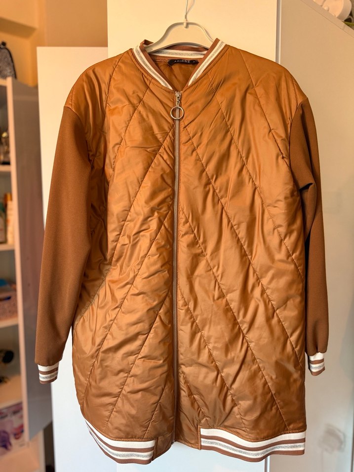 Kadınlar için parlak kahverengi sentetik kumaştan yapılmış, fermuarlı ve uzun kollu bir midi mont. Rahat kesimi ve yaka detayıyla günlük sokak stiline uygundur. ✨