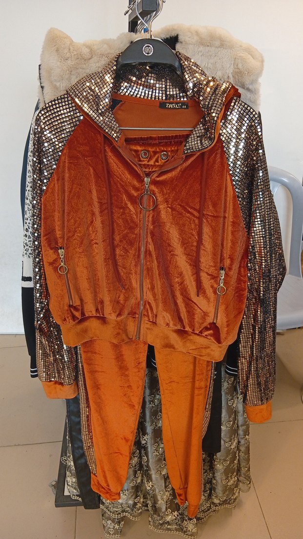 Kadınlar için parlak kahverengi süet, payetli desenli uzun kollu ve yüksek yakalı bol kesim eşofman. Günlük sokak giyimine uygun. ✨