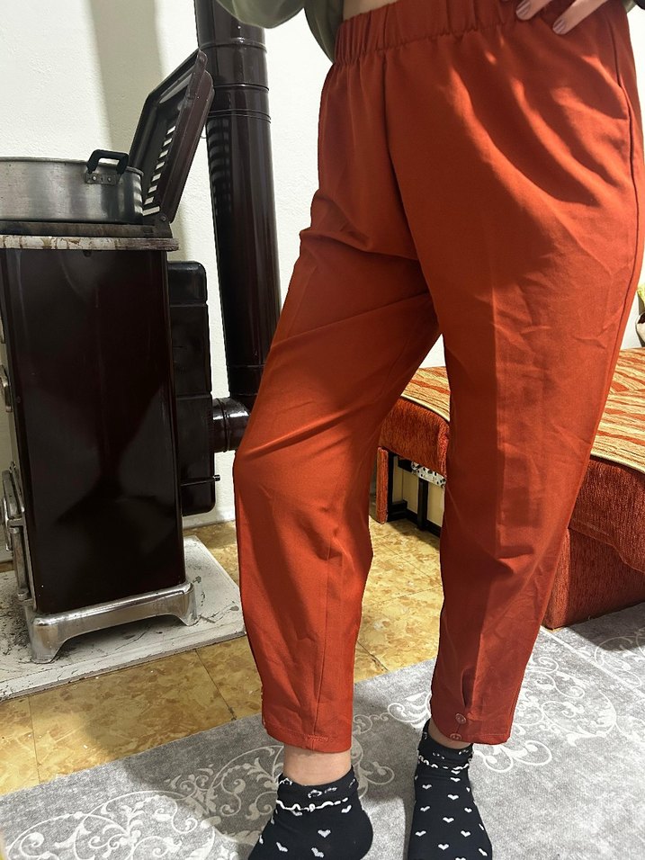Kadınlar için bu parlak kahverengi saten pantolonlar, midi boy ve regular fit olup, günlük kullanım için zahmetsiz şıklık sunar. Desensiz kumaşı sokak stiline parlaklık katar. ✨ bana dar geldiği için biraz tuhaf duruyor s beden tam olur