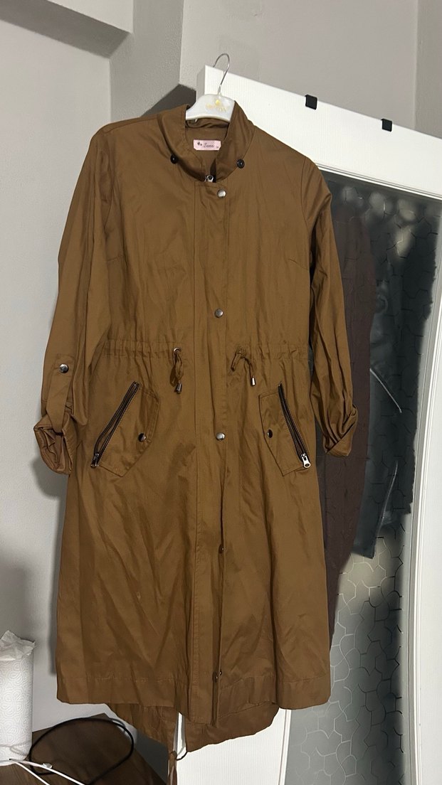 Parlak kahverengi uzun trençkot, düğmeli, çıtçıtlı, uzun kollu ve cep fermuarlı. Salaş kesimiyle sokak stiline uygun bir parça.