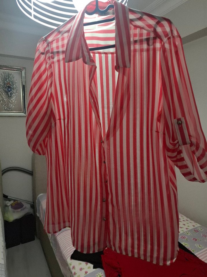 yarım kollu, düğmeli, bol kesim kadın gömlek. Parlak pwmbeı-beyaz çizgili, V yaka tasarımlı, rahat sokak stili için uygundur. şifon