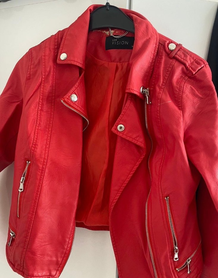 DEFOSU İÇ KISIMDA O DA GİYİNCE BELLİ OLMUYOR İÇ KISIMDA KALIYOR. Parlak kırmızı deri biker ceket, fermuarlı detaylar ve kesik yaka ile. Sıkı kesim, askılı kollu, günlük şıklık için uygun. Marka: ViSION.