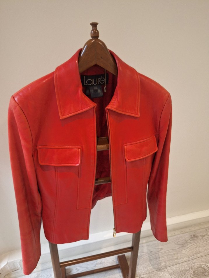 orjinal Laurel marka Kadınlar için parlak kırmızı deri ceket, çıtmalı yakalı ve fermuarlı önde. Normal kesim ve midi boy, ofis kullanımı için uygun. Desensiz, Laurel tasarımı.