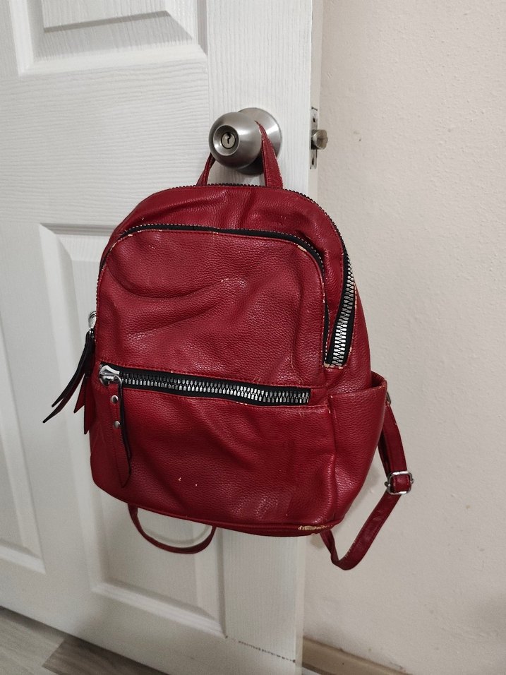 Parlak kırmızı deri ve tokalı detaylara sahip kadın sırt çantası. Minimalist, desensiz tasarımıyla günlük kullanıma uygundur. orijinal Derimod