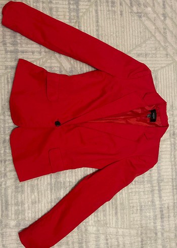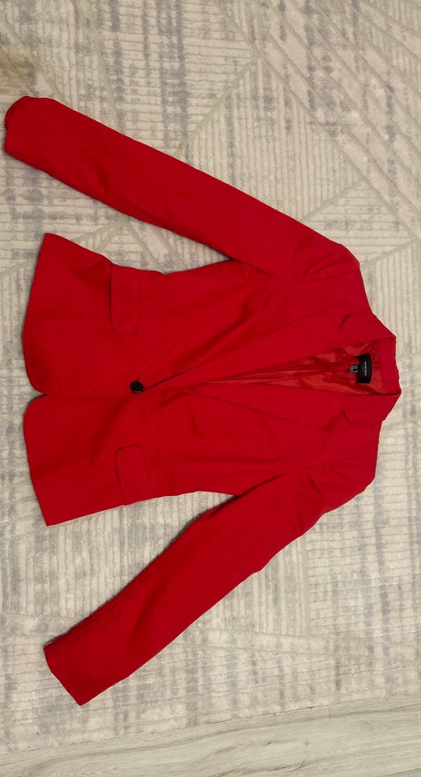 Kadınlar için parlak kırmızı, düğmeli, normal boy, dar kesim blazer ceket. Notch yaka ve uzun kolludur, ofis ortamına uygundur. Herhangi bir hasarı yoktur