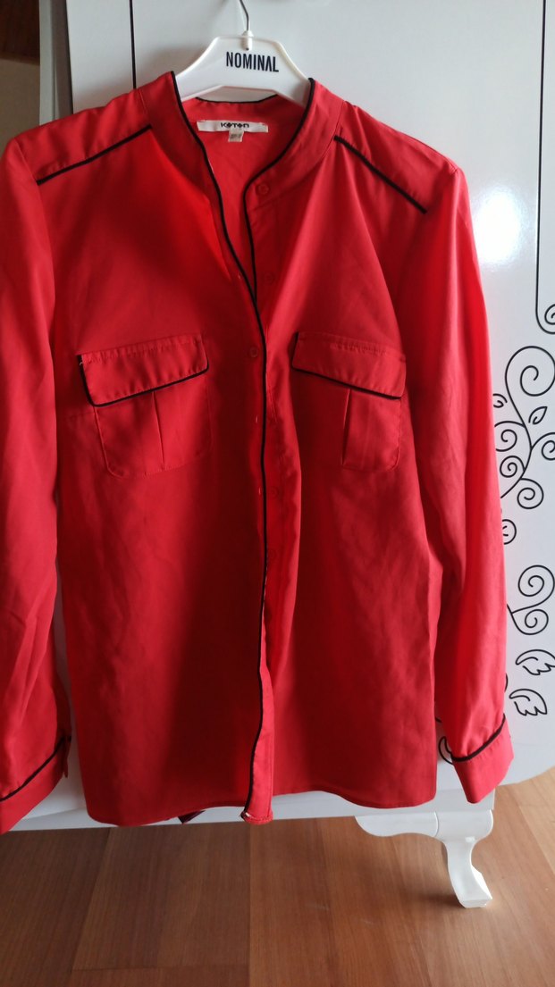 Kadınlar için parlak kırmızı renkte, uzun kollu, düğmeli, normal boy midi gömlek. Notlu yaka ve cep detayları ile rahat ve salaş kesim. nar çiçeği rengi