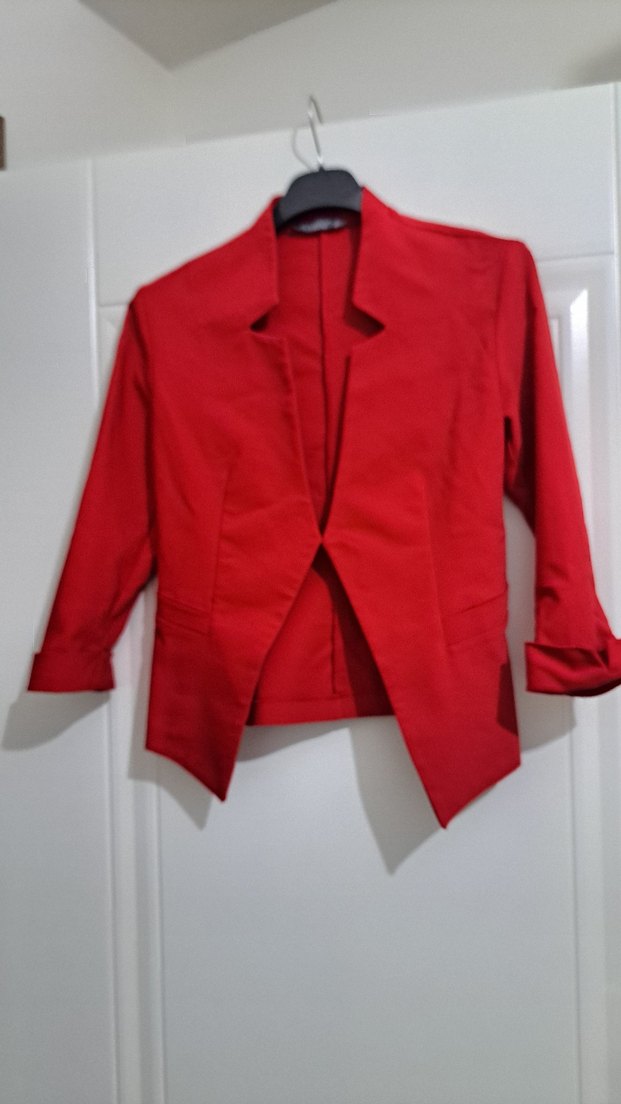 Kadınlar için parlak kırmızı renkte, düğmeli ve kesik yakalı mini blazer. Sentetik kumaştan, uzun kollu ve regular fit kesim ofis tarzı.