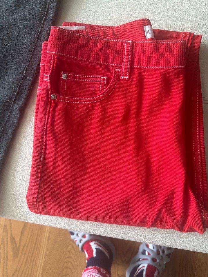 Kadınlar için parlak kırmızı renkte, sentetik kumaştan, bol kesim ve normal midi boyda jean. Fermuar detaylarıyla günlük rahat sokak stili için uygundur.