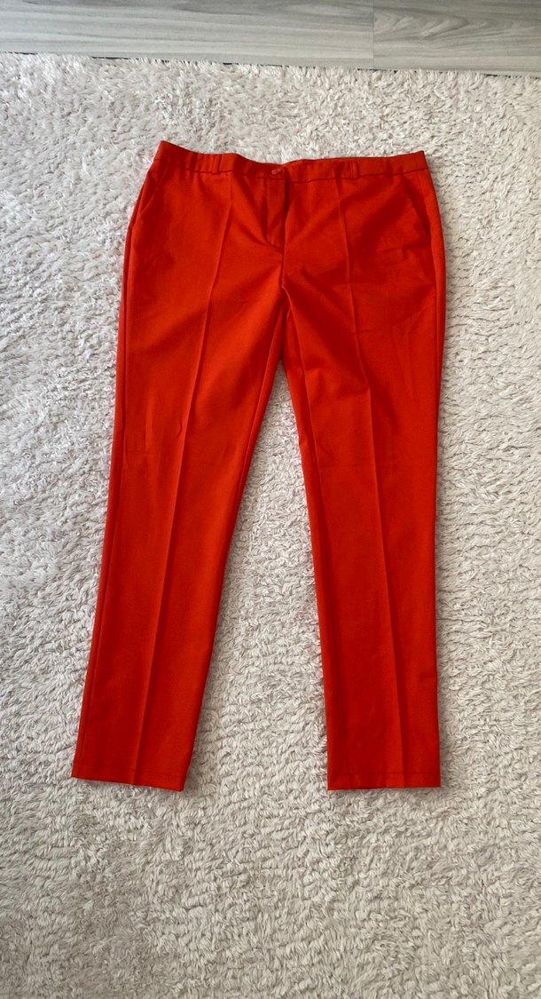 Kadınlar için parlak kırmızı sentetik kumaştan, fermuarlı, midi boy ve desen içermeyen normal kesim pantolon. Ofis kullanımı için uygundur.