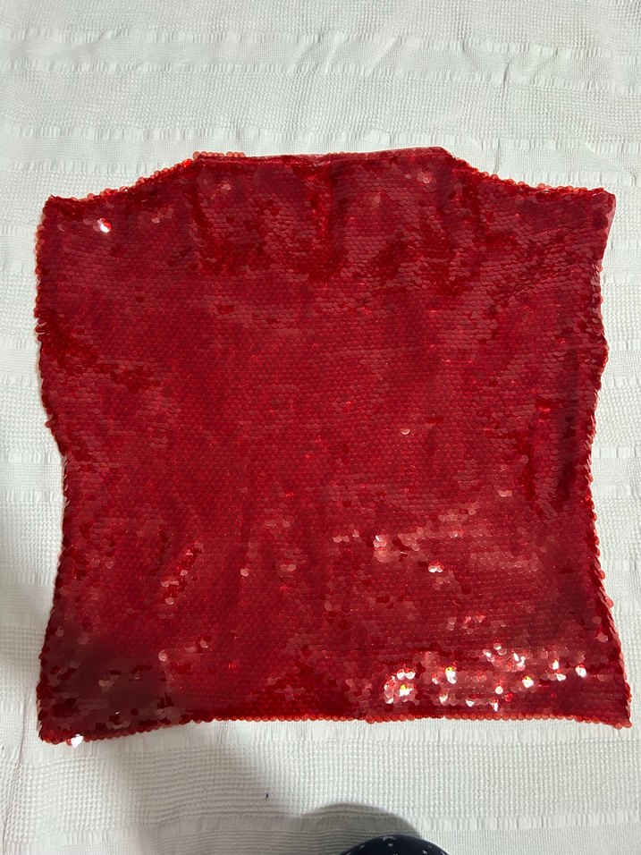 Sentetik kumaştan, payetlerle kaplı parlak kırmızı bluz