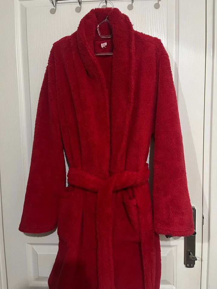 Parlak kırmızı renkte, uzun kollu, midi boyda, belden bağlı kadın sabahlık Düz dokusu ve rahat kesimiyle konforlu bir seçenek.
