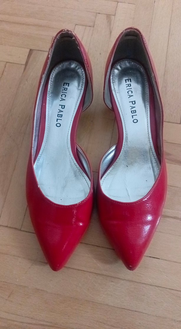 Erica Pablo imzalı, parlak kırmızı renkli, stiletto mini topuklu. Arka kısmında çok hafif bir lekesi gar, fotografta belirtildi. Cesur Paris tarzını yansıtan çağdaş tasarım, romantik akşamlar için uygun.