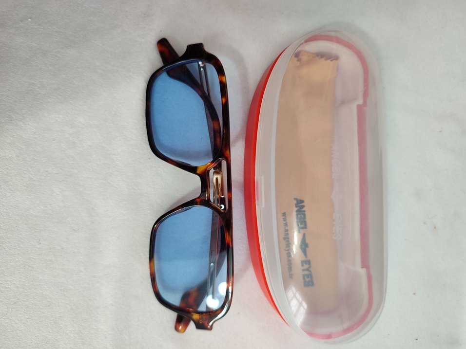 Kadınlar için parlak, renkli mavi camlı, minimalist sokak stili gözlük. Çerçeve hafif kaplumbağa deseni taşır ve 'EYE' yazılı koruyucu kılıfla gelir.