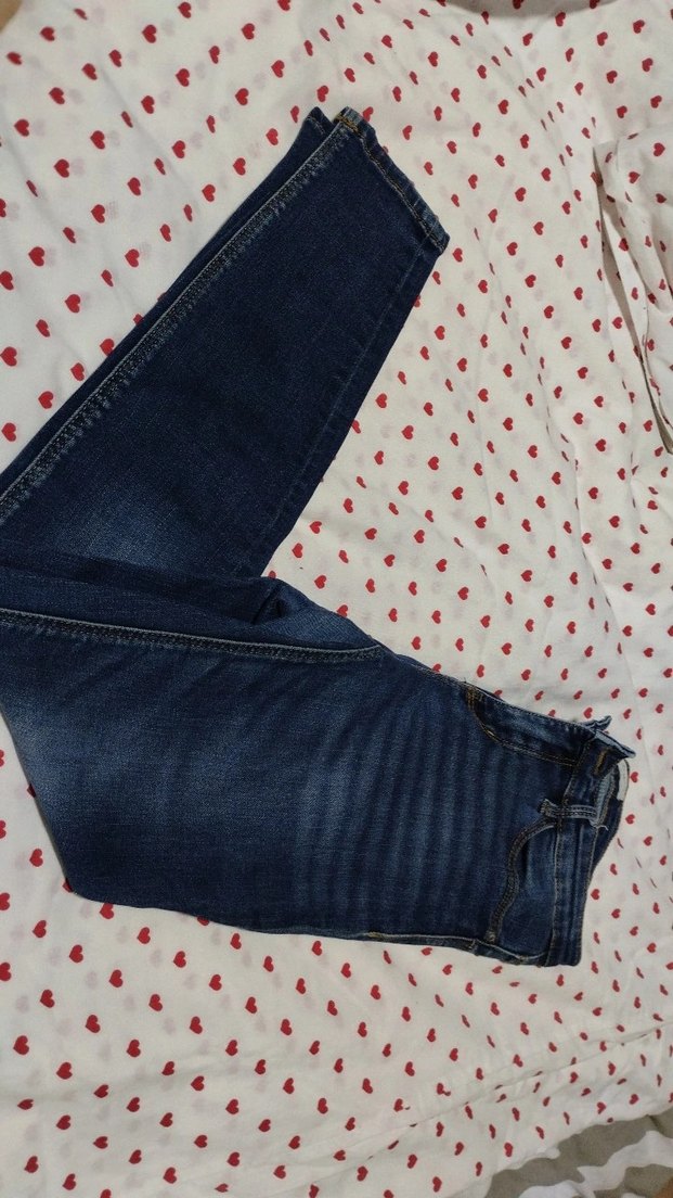 Parlak mavi renkte, kemerli ve dar kesim kadın denim pantolon. Rahat midi boyunda, günlük kullanım için uygun sokak tarzı bir modeldir.