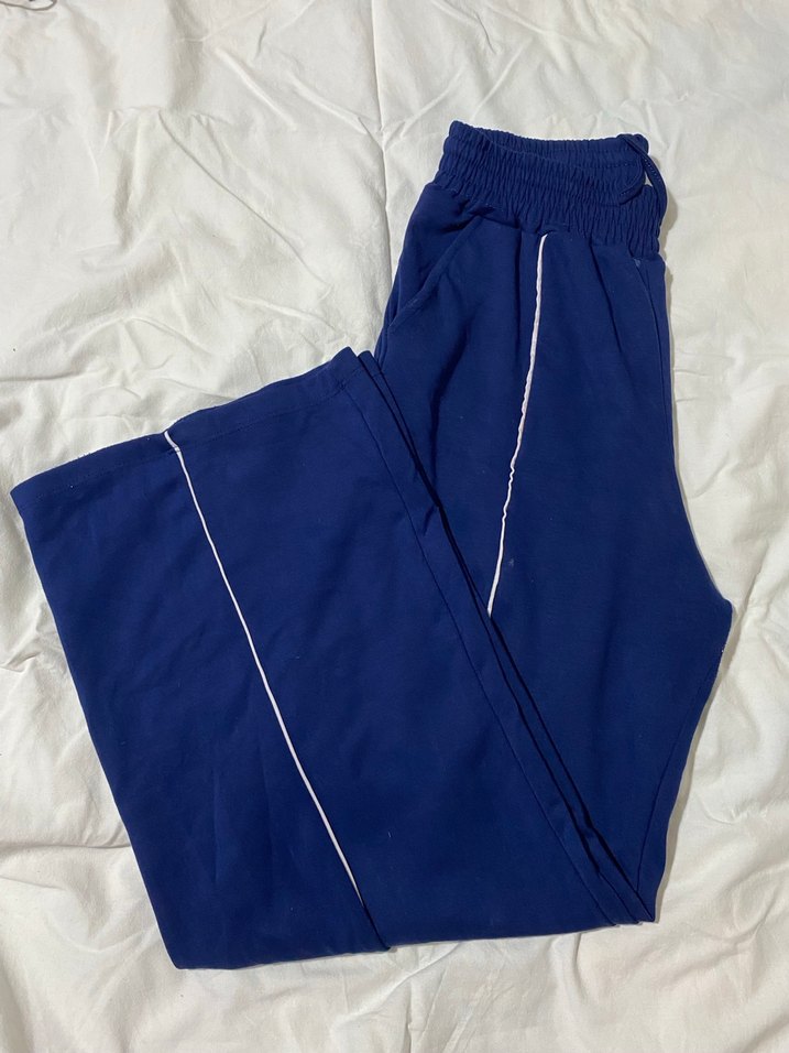 Kadınlar için bol kesim, parlak mavi renkte fermuarlı eşofman altı. Yumuşak ve sıcak kumaştan, spor ve sokak stili için uygun. Midi boy ve rahat bel kısmı.