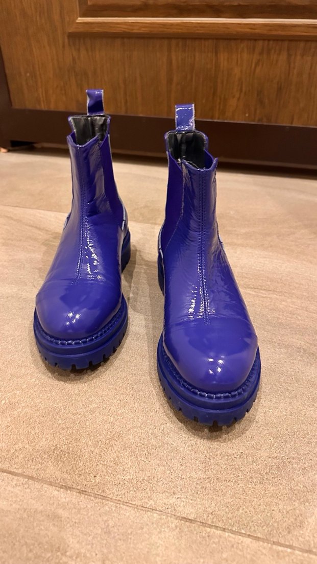 Parlak mavi kauçuk malzemeden kadın botu, kalın topuklu ve parlak yüzeyli, çağdaş sokak stili tasarımıyla günlük kullanıma uygun. 2 kez giyildi sıfır ayarındadır problemsizdir