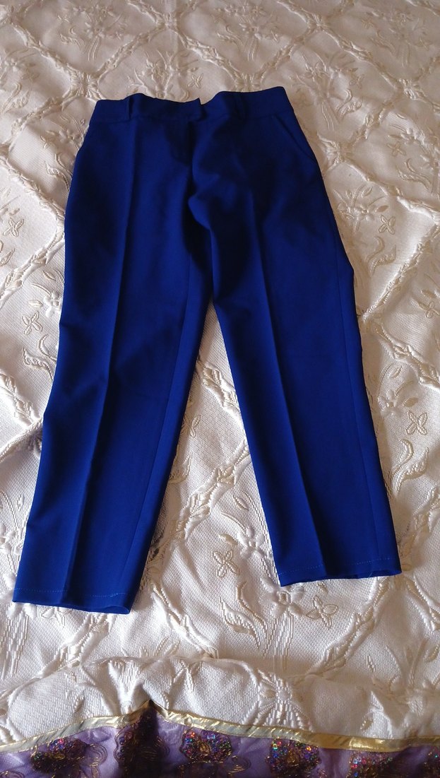 Kadınlar için parlak mavi renkte, pilili, normal boyda kumaş pantolon. İpek gibi yumuşak malzemeden olup ofis kullanımı için uygundur. Desensiz, sade ve temel tarzda.