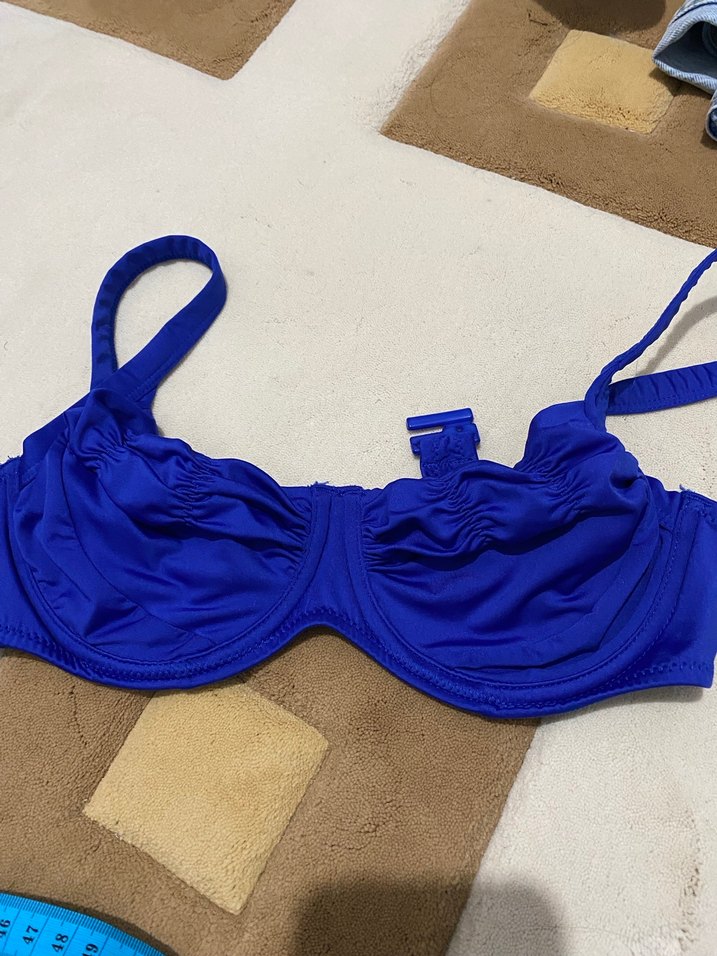 Parlak mavi renkte, askılı ve vücuda oturan kadın bikini üstü. Minimalist ve şık tasarımıyla plaj için uygun.