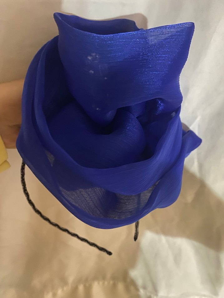 Kadınlar için parlak mavi, ipek gibi yumuşak kumaştan drapeli taç. Avant-garde ve modaya uygun tarzlar için ideal.